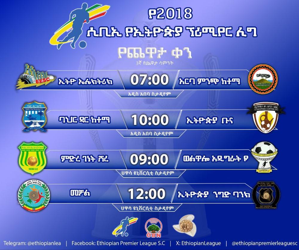 Onkoloolessa18/2018(TOI)- Piriimerliigii Itiyoophiyaatti sagantaan torban 3ffaa har’aa eegalee gaggeeffama . Humni Ibsaa Ityoophiyaa Magaala Aarbaaminici waliin Guyyaa keessaa sa’aatii 7:00 Istaadiyeemii Magaalaa Finfinneetti taphatama. Humni Ibsaa Itiyoophiyaa qabxii Afuriin sadarkaa 5ffaa,Magaalaan Aarbaaminci qabxii lamaan sadarkaa 11ffaa qabateera. Kilaboonni lameen bara 2017 taphoota lama liigichatti walii waliin gaggeessaniin haala wal fakkaatuun yeroo tokko mo’eera . Magaalan Baahirdar Buna Itiyoohiyaa waliin guyyaa keessaa sa’aatii 10:00 Istaadiyeemii Magaalaa Finfinneetti taphatan sagantaawwan torbanii eeggaman keessaatti argama. Liigichatti Magaalaan Baahirdaar qabxii 4n sadarkaa 2ffaa yeroo qabatu Bunni Itiyoophiyaa qabxii sadiin sadarkaa 9ffa argama. Istaadiyeemii Yuunvarsiitii Hawaasaatti guyyaa sa’aatii 9:00 Midire Gannet Shireen Yuunvarsiitii Walwalo addagitraat waliin taphasaanii gaggeessu. Midiregannat shireen qabxii 4 sadarkaa 6ffaa, yuunvarsitiin walwaloo addagiraat qabxii tokko malee sadarkaa dhumaa qabateera. Baankiin daldala Itiyoophiyaa machaal waliin galgala sa’aatii12:00 taphasanii gaggeessu. Injifatan liigichaa bara 2016 Baankiin Daldala Itiyoophiyaa qabxii lamaan sadarkaa 12ffaarratti argama. Machaal qabxii Afuriin sadarkaa 4ffaa qabateera. Piriimer liigii Itiyoophiyaatti sagantaan torban 3ffaan hanga onkoloolessa 20 bara 2018 ni tura.
