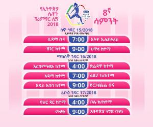 አዲስ አበባ፤ ሕዳር 15/2018 (ኢዜአ)፦ የኢትዮጵያ ሴቶች ፕሪሚየር ሊግ ስምንተኛ ሳምንት መርሃ ግብር ዛሬ ይጀመራል። ከቀኑ 7 ሰዓት ሲዳማ ቡና ከኢትዮ ኤሌክትሪክ በኢትዮጵያ ንግድ ባንክ ሜዳ ጨዋታቸውን ያደርጋሉ። ሲዳማ ቡና በዘጠኝ ነጥብ ስድስተኛ ደረጃን ይዟል። ተጋጣሚው ኢትዮ ኤሌክትሪክ በ21 ነጥብ የሊጉ አናት ላይ ተቀምጧል። ኢትዮ ኤሌክትሪክ ካሸነፈ የሊጉን መሪነት ያጠናክራል። ሲዳማ ቡና በሰባተኛ ሳምንት በድሬዳዋ ከተማ ካጋጠመው ሽንፈት በኋላ ወደ አሸናፊነት ለመመለስ ይጫወታል። በሌላኛው መርሃ ግብር ሸገር ከተማ ከሃዋሳ ከተማ ከቀኑ 9 ሰዓት በኢትዮጵያ ንግድ ባንክ ሜዳ ጨዋታቸውን ያደርጋሉ። ሸገር ከተማ በ12 ነጥብ አምስተኛ፣ ሃዋሳ ከተማ በ15 ነጥብ ሶስተኛ ደረጃን ይዘዋል። ወቅታዊ ብቃታቸው በጥሩ ደረጃ ላይ የሚገኙት ሁለት ክለቦች የሚያደርጉት ጨዋታ ጠንካራ ፉክክር ይደረግበታል ተብሎ ይጠበቃል ። የስምንተኛ ሳምንት መርሃ ግብር እስከ ሕዳር 17 ቀን 2018 ዓ.ም ይቆያል።