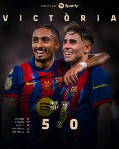 አዲስ አበባ፤ ታህሳስ 29/2018(ኢዜአ)፦ በስፔን የአሸናፊዎች አሸናፊ ዋንጫ የመጀመሪያ የግማሽ ፍጻሜ ጨዋታ ባርሴሎና አትሌቲኮ ቢልባኦን 5 ለ 0 በሆነ ሰፊ የግብ ልዩነት አሸንፏል። ማምሻውን በሳዑዲ አረቢያ ኪንግ አብደላ ስፖርትስ ሲቲ ስታዲየም በተካሄደው ጨዋታ ራፊኒያ ሁለት ግቦችን ሲያስቆጥር ፌርሚን ሎፔዝ፣ ፌራን ቶሬስ እና ሮኒ ቀሪዎቹን ጎሎች ከመረብ ላይ አሳርፈዋል። በጨዋታው ላይ ባርሴሎና ከፍተኛ ብልጫ ወስዶ ተጫውቷል። ባርሴሎና በስፔን የአሸናፊዎች አሸናፊ ዋንጫ ለፍጻሜ ያለፈ የመጀመሪያው ክለብ ሆኗል። በፍጻሜው ከአትሌቲኮ ማድሪድ እና ሪያል ማድሪድ አሸናፊ ጋር ይጫወታል። አትሌቲኮ ማድሪድ እና ሪያል ማድሪድ ነገ ጨዋታቸውን ያደርጋሉ።