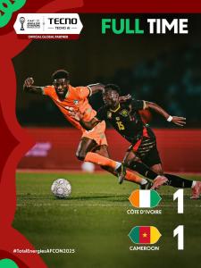 አዲስ አበባ፤ ታህሳስ 19/2018(ኢዜአ)፦ በ35ኛው የአፍሪካ ዋንጫ የምድብ ስድስት ጨዋታ ኮትዲቯር እና ካሜሮን አቻ ተለያይተዋል። ማምሻውን በማራካሽ ስታዲየም በተደረገው ጨዋታ የማንችስተር ዩናይትዱ አማድ ዲያሎ በ51ኛው ደቂቃ በግሩም ሁኔታ ያስቆጠራት ግብ ኮትዲቯርን መሪ አድርጓል። አማድ በውድድሩ ላይ ሁለተኛ ግቡን ማስቆጠር ችሏል። የኮትዲቯሩ ተከላካይ ጊስላን ኮናን በ56ኛው ደቂቃ በራሱ ላይ ባስቆጠረው ግብ ካሜሮን አቻ ሆናለች። በ48ኛው ደቂቃ የኮትዲቯሩ ፍራንክ ኬሲ ያስቆጠራት ግብ በቪዲዮ በታገዘ ዳኝነት (ቫር) ከጨዋታ ውጪ በመሆኑ ተሽሯል። ጨዋታው እንደ ተጠባቂነቱ ጠንካራ ፉክክር ተደርጎበታል። የአፍሪካ እግር ኳስ ኮንፌዴሬሽን (ካፍ) ፕሬዝዳንት ፓትሪስ ሞትሴፔ(ዶ/ር) በስታዲየሙ ተገኝተው ጨዋታውን ተመልክተዋል። የሪያል ማድሪድ ተጫዋቾች የሆኑት ኪሊያን ምባፔ እና ኦሪየር ቹዌሜኒ (ሁለቱም በትውልድ ካሜሮናዊ በዜግነት ፈረንሳዊ)፣ የካሜሮን የቀድሞ ተጫዋች አሌክሳንደር ሶንግ እንዲሁም የባርሴሎናው ጁል ኩንዴ (በትውልድ ቤኒናዊ በዜግነት ፈረንሳዊ) ጨዋታውን በስታዲየም ተገኝተው ተከታትለዋል። የካሜሮን እግር ኳስ ፌዴሬሽን ፕሬዝዳንት እና የቀድሞ ተጫዋች ሳሙኤል ኤቶ በስታዲየሙ ታድሟል። ጨዋታውን ከ35 ሺህ በላይ ተመልካቾች ተከታትለውታል። ውጤቱን ተከትሎ የወቅቱ የዋንጫ ባለቤት ኮትዲቯር እና የአምስት ጊዜ የውድድሩ አሸናፊ ካሜሮን በተመሳሳይ አራት ነጥብ በግብ ክፍያ ተበላልጠው ኮትዲቯር እና ካሜሮን አንደኛ እና ሁለተኛ ደረጃን ይዘዋል። ዛሬ በምድብ ስድስት በተደረገ ጨዋታ ሞዛምቢክ ጋቦንን 3 ለ 2 አሸንፋለች። የምድብ ስድስት የመጨረሻ መርሃ ግብር ረቡዕ ታህሳስ 22 ቀን 2018 ዓ.ም ይካሄዳል። ጋቦን ከኮትዲቯር እና ሞዛምቢክ ከካሜሮን ይጫወታሉ። ጨዋታዎቹ በምድቡ ወደ ጥሎ ማለፍ የሚገቡ ሀገራትን የሚለዩ ናቸው።