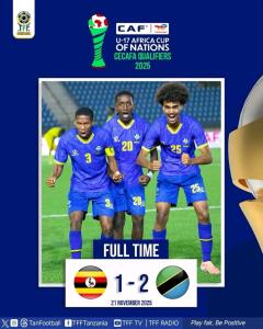 አዲስ አበባ፤ ሕዳር 12/2018(ኢዜአ)፦ በ16ኛው ከ17 ዓመት በታች የአፍሪካ ዋንጫ የሴካፋ ዞን ማጣሪያ የምድብ ሁለት ጨዋታ ታንዛንያ ዩጋንዳን 2 ለ 1 አሸንፋለች። ማምሻውን በድሬዳዋ ዓለም አቀፍ ስታዲየም በተደረገው ጨዋታ ዲስማስ አትሃናስ እና ሶአን አዳም የማሸነፊያ ግቦቹን አስቆጥረዋል። ኢስማኤል ፋሃድ ለዩጋንዳ ብቸኛውን ጎል ከመረብ ላይ አሳርፏል። ውጤቱን ተከትሎ ታንዛንያ በዘጠኝ ነጥብ አንድ ጨዋታ እየቀራት ግማሽ ፍጻሜውን የተቀላቀለች የመጀመሪያ ሀገር ሆናለች። በምድቡ የመጀመሪያ ሽንፈቷን ያስተናገደችው ዩጋንዳ በስድስት ነጥብ ሁለተኛ ደረጃን ይዛለች። በዚሁ ምድብ ቀን ላይ በተካሄደ ጨዋታ ብሩንዲ ጅቡቲን 1 ለ 0 አሸንፋለች።