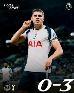 አዲስ አበባ፤ ጥቅምት 16/2018 (ኢዜአ):- በእንግሊዝ ፕሪሚየር ሊግ የ10ኛ ሳምንት የመጨረሻ መርሃ ግብር ቶተንሃም ሆትስፐርስ ኤቨርተንን 3 ለ 0 አሸንፏል። ማምሻውን በሂል ዲኪንሰን ስታዲየም በተደረገው ጨዋታ ኔዘርላንዳዊው ተከላካይ ሚኪ ቫን ደቬን ሁለት ግቦችን ሲያስቆጥር ፓፔ ሳር ቀሪዋን ጎል ከመረብ ላይ አሳርፏል። ኤቨርተን በአዲሱ ስታዲየሙ የመጀመሪያ ሽንፈቱን አስተናግዷል። ውጤቱን ተከትሎ በሊጉ አምስተኛ ድሉን ያስመዘገበው ቶተንሃም ሆትስፐርስ በ17 ነጥብ ደረጃውን ወደ ሶስተኛ ከፍ አድርጓል። በአንጻሩ በውድድር ዓመቱ አራተኛ ሽንፈቱን ያስተናገደው ኤቨርተን በ11 ነጥብ 14ኛ ደረጃን ይዟል።