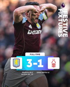 አዲስ አበባ፤ ታህሳስ 25/2018 (ኢዜአ)፦ በእንግሊዝ ፕሪሚየር ሊግ የ20ኛ ሳምንት የመጀመሪያ ጨዋታ አስቶንቪላ ኖቲንግሃም ፎረስትን 3 ለ 1 አሸንፏል። በቪላ ፓርክ ስታዲየም በተካሄደው ጨዋታ ጆን ማክጊን ሁለት ግቦችን ሲያስቆጥር ኦሊ ዋትኪንስ ቀሪዋን ጎል ከመረብ ላይ አሳርፏል። በሊጉ 13ኛ ድሉን ያስመዘገበው አስቶንቪላ በ42 ነጥብ ከሶስተኛ ደረጃ ወደ ሁለተኛ ከፍ ብሏል። በአንጻሩ በውድድር ዓመቱ 12ኛ ሽንፈቱን ያስተናገደው ኖቲንግሃም ፎረስት በ18 ነጥብ 17ኛ ደረጃን ይዟል። ሞርጋን ጊብስ-ዋይት ለኖቲንግሃም ፎረስት ብቸኛውን ግብ አስቆጥሯል።