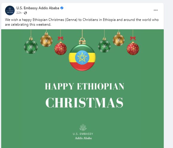 በኢትዮጵያ የአሜሪካ ኤምባሲ ለክርስትና እምነት ተከታዮች መልካም የገና በዓል ምኞቱን ገልጿል።