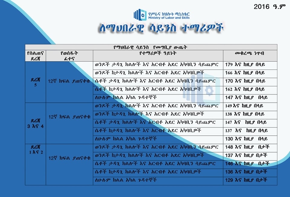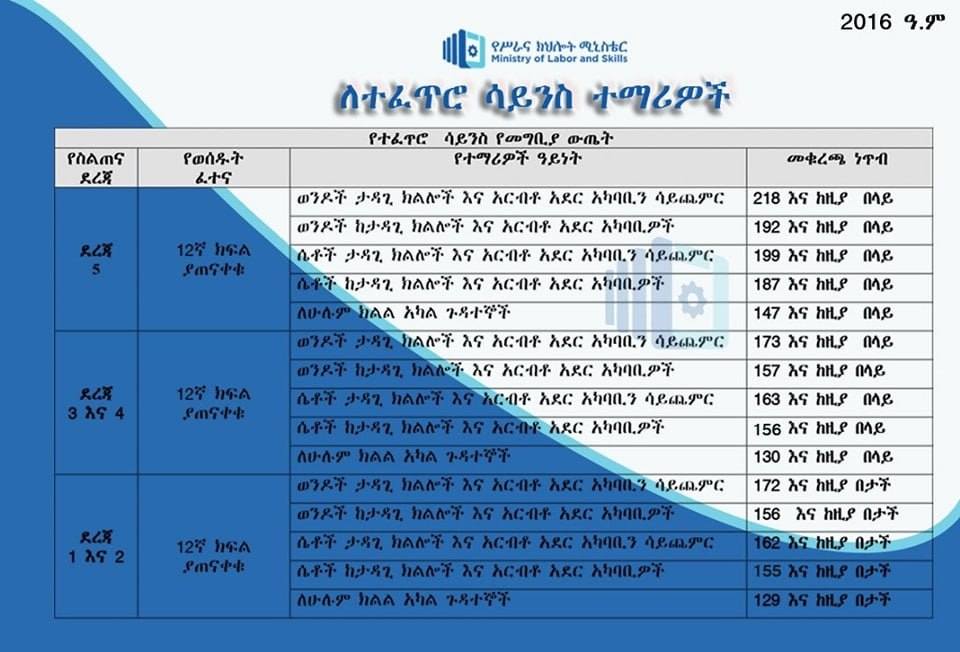 የሥራና ክህሎት ሚኒስቴር በ2016 ዓ.ም ቴክኒክና ሙያ ስልጠና ተቋማት ያዘጋጀው የመግቢያ ነጥብ ከዚህ በታች ባለው ሰንጠረዥ ቀርቧል፡-