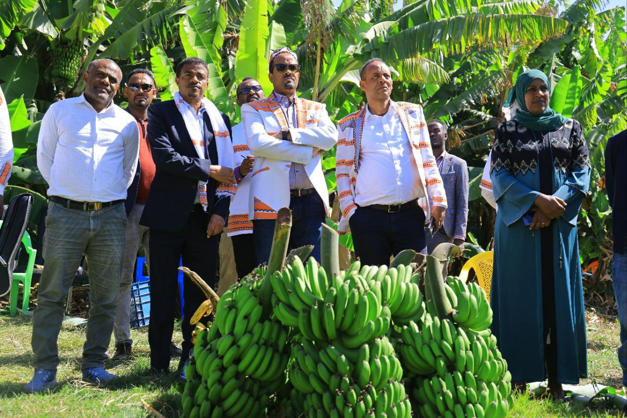 አመራሮቹ በወረዳው ምዕራብ ቆጪና ሰዳጎራ ቀበሌዎች በ45 ሄክታር መሬት ላይ እየለማ ያለውን የሙዝ ምርት ጎብኝተዋል።