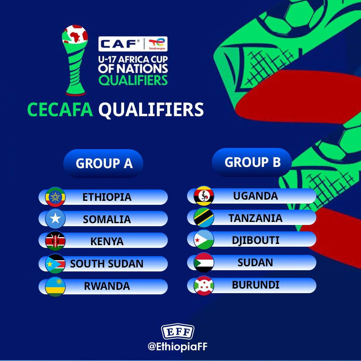 በምድብ አንድ አዘጋጇ ኢትዮጵያ ከሶማሊያ፣ ኬንያ፣ ደቡብ ሱዳን እና ሩዋንዳ ጋር መደልደሏን የኢትዮጵያ እግር ኳስ ፌዴሬሽን አስታውቋል።