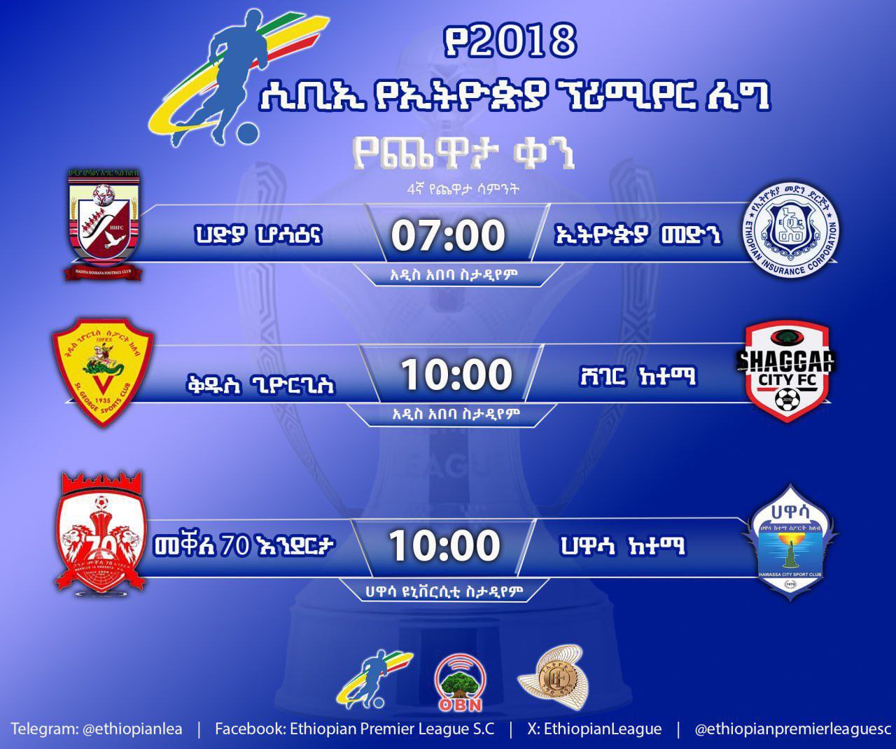 ከቀኑ 7 ሰዓት በአዲስ አበባ ስታዲየም ሀድያ ሆሳዕና ከኢትዮጵያ መድን ይጫወታሉ።