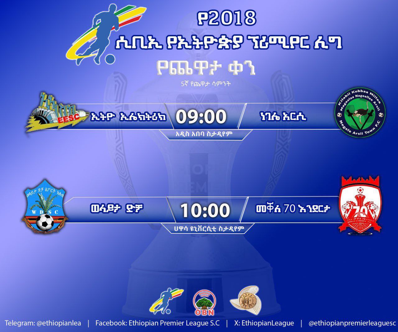 ከቀኑ 9 ሰዓት ላይ ኢትዮ ኤሌክትሪክ ከነገሌ አርሲ በአዲስ አበባ ስታዲየም ይጫወታሉ።
