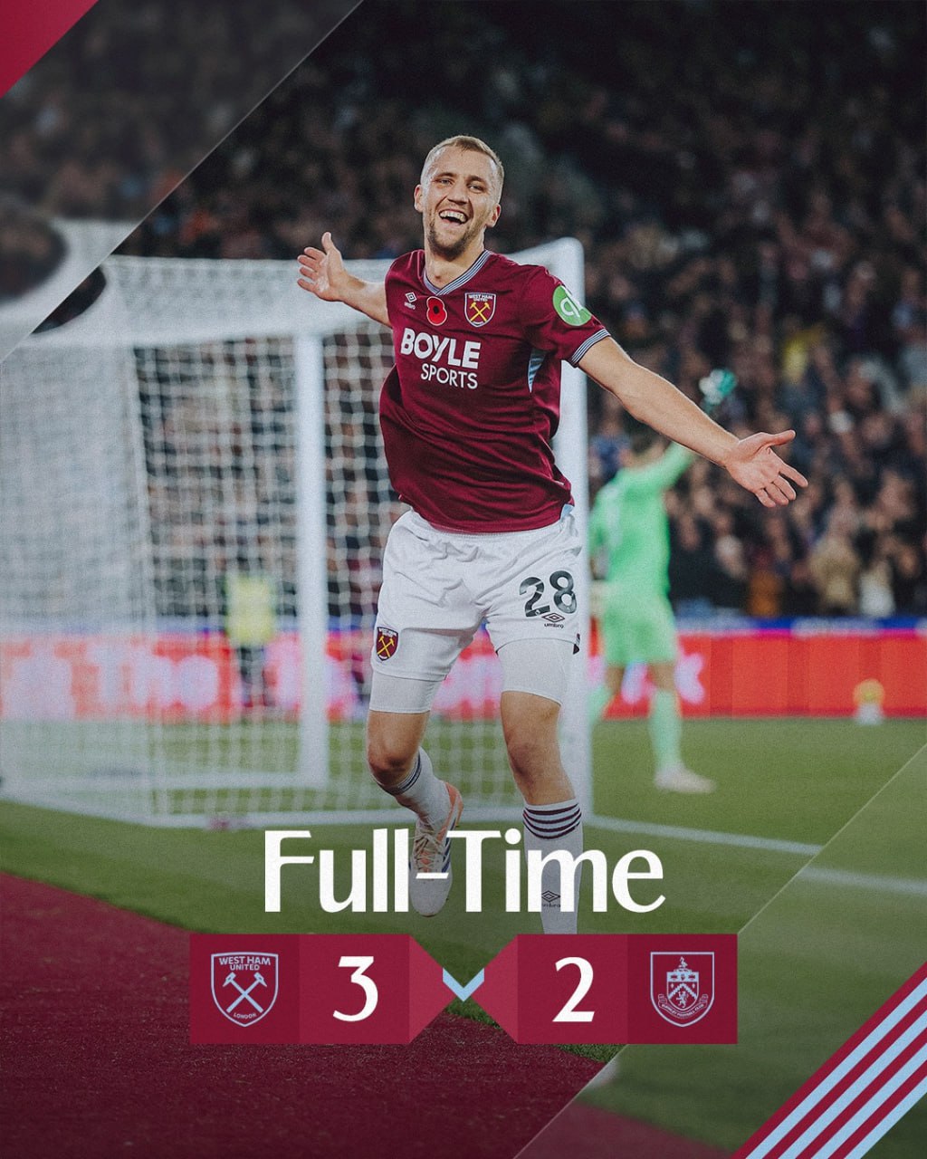 ማምሻውን በለንደን ስታዲየም በተካሄደው ጨዋታ ዌስትሃም ዩናይትድ በርንሌይን 3 ለ 2 አሸንፏል።