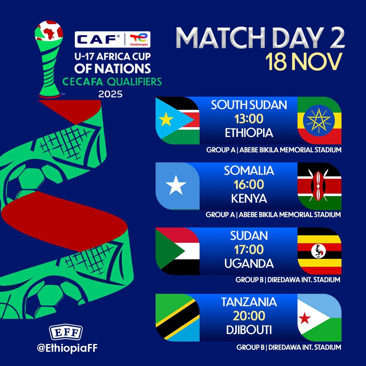ሶማሊያ በመጀመሪያ የምድብ ጨዋታ ከደቡብ ሱዳን ጋር ሁለት አቻ ተለያይታለች። ኬንያ በምድቧ የመጀመሪያ ጨዋታዋን ታደርጋለች።