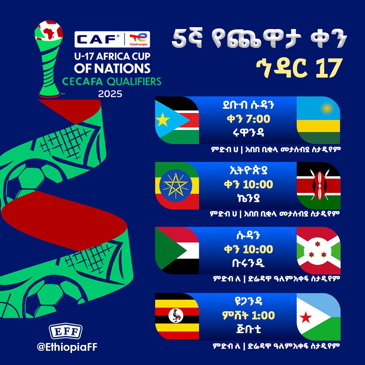 በምድብ ሁለት ዩጋንዳ ከጅቡቲ ከምሽቱ አንድ ሰዓት ላይ በድሬዳዋ ዓለም አቀፍ ስታዲየም ጨዋታቸውን ያደርጋሉ።