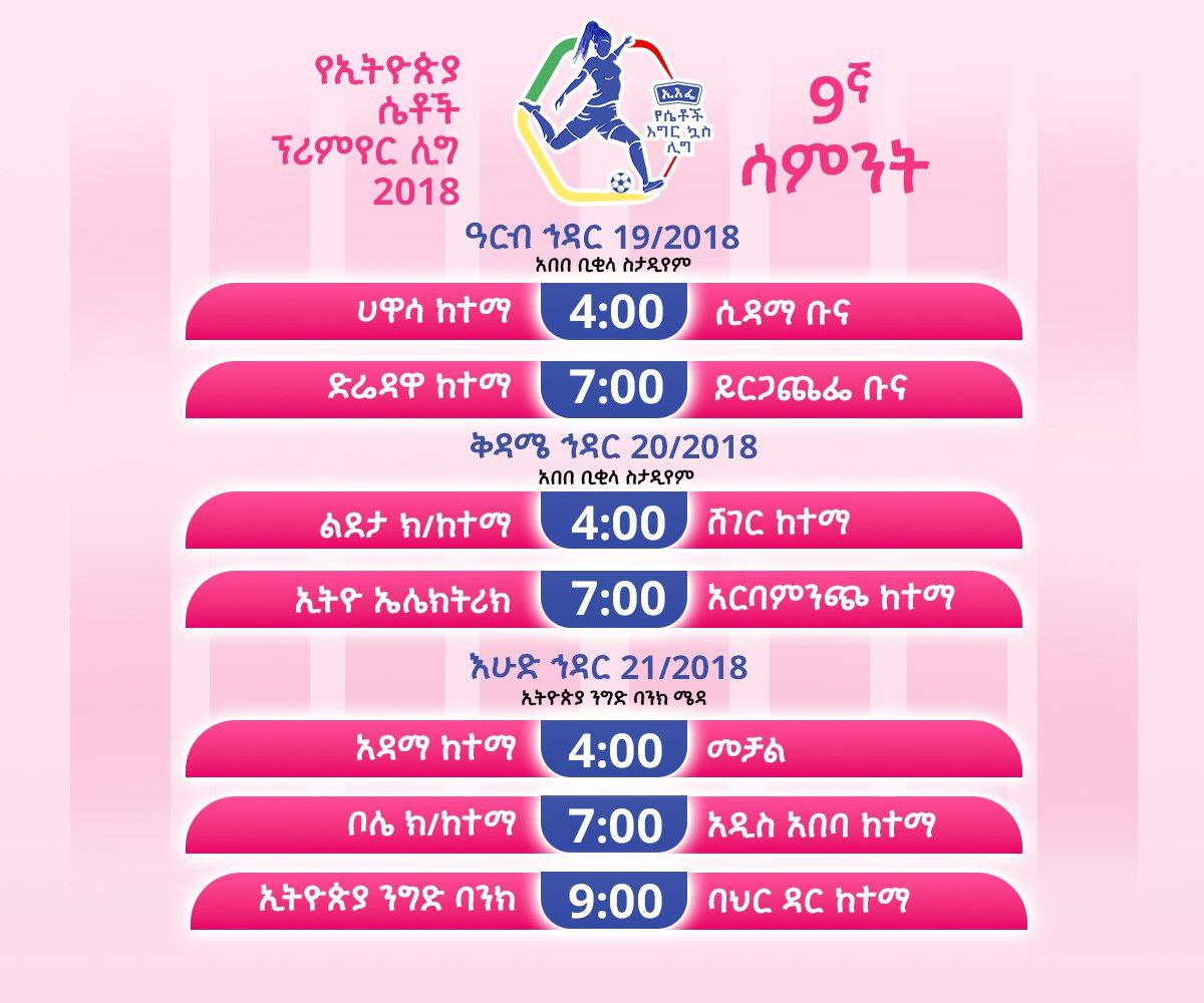 የኢትዮጵያ ሴቶች ፕሪሚየር ሊግ የዘጠነኛ ሳምንት መርሃ ግብር እስከ ሕዳር 21 ቀን 2018 ዓ.ም ይቆያል።