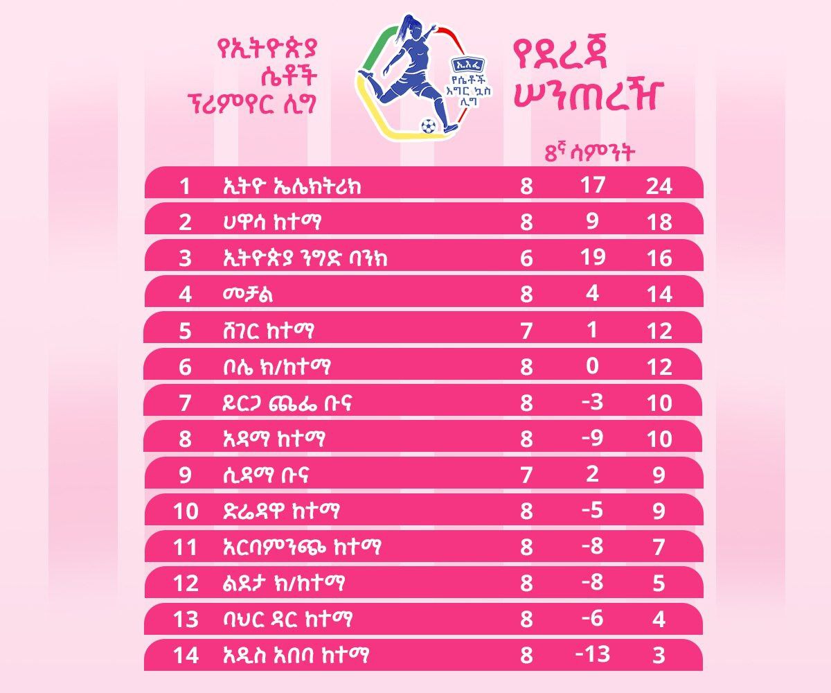 ኢትዮ ኤሌክትሪክ በ24 ነጥብ ሊጉን እየመራ ነው። ባህር ዳር ከተማ እና አዲስ አበባ ከተማ 13ኛ እና 14ኛ ደረጃን ይዘው ወራጅ ቀጠና ውስጥ ይገኛሉ።