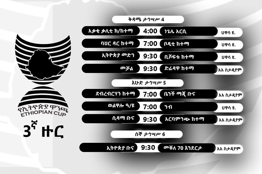 አዲስ አበባ፤ ታህሳስ 5/2018(ኢዜአ)፦ በኢትዮጵያ ዋንጫ ሶስተኛ ዙር የሁለተኛ ቀን ውሎ ሶስት ጨዋታዎች ይደረጋሉ።