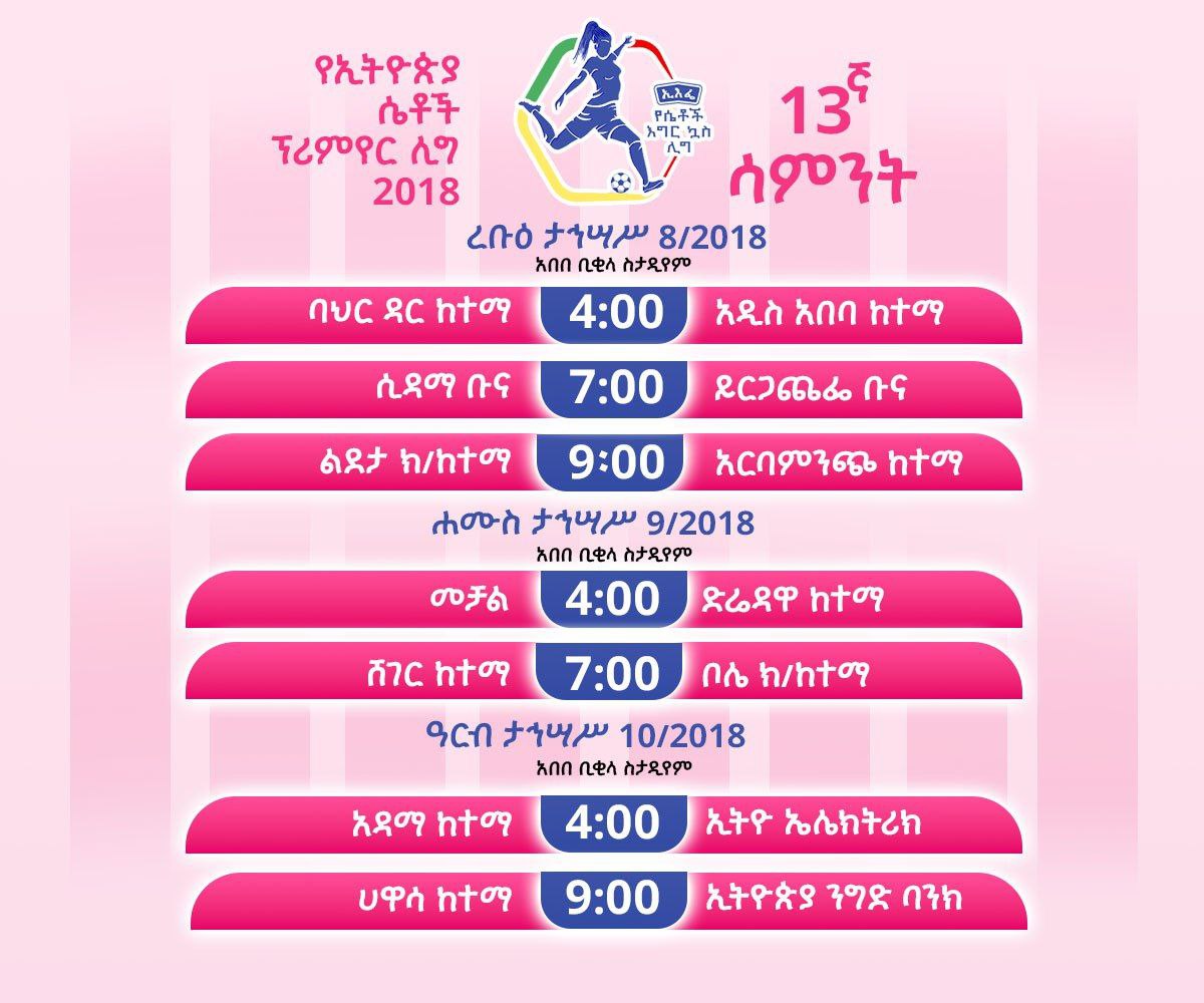 አዲስ አበባ፤ ታህሳስ 9/2018 (ኢዜአ)፦ በኢትዮጵያ ሴቶች ፕሪሚየር ሊግ 13ኛ ሳምንት ዛሬ ሁለት ጨዋታዎች በአበበ ቢቂላ መታሰቢያ ስታዲየም ይካሄዳሉ።