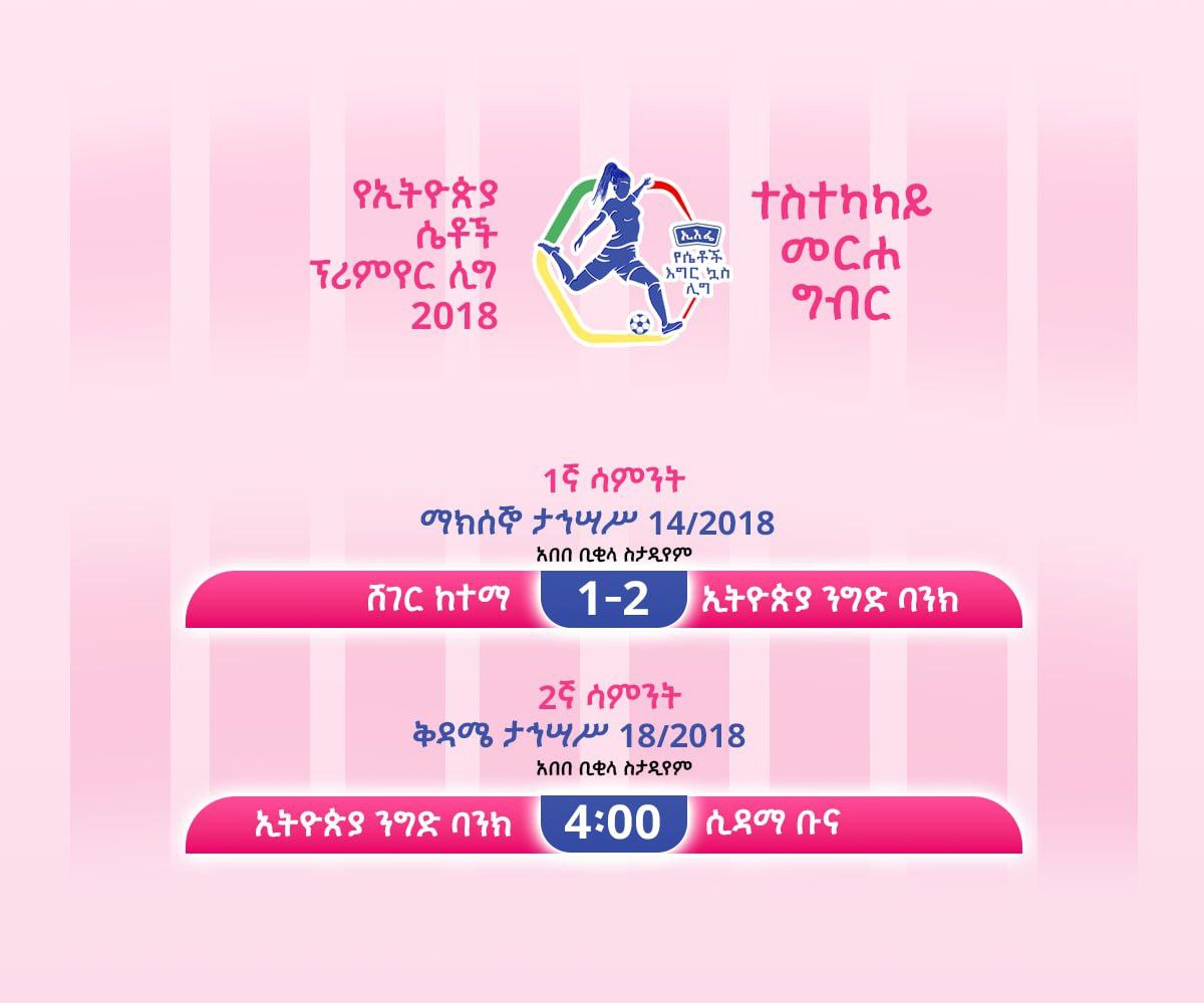 አዲስ አበባ፤ ታህሳስ 18/2018 (ኢዜአ)፦ በኢትዮጵያ ሴቶች ፕሪሚየር ሊግ የሁለተኛ ሳምንት ተስተካካይ መርሃ ግብር ኢትዮጵያ ንግድ ባንክ ከሲዳማ ቡና ዛሬ ይጫወታሉ።