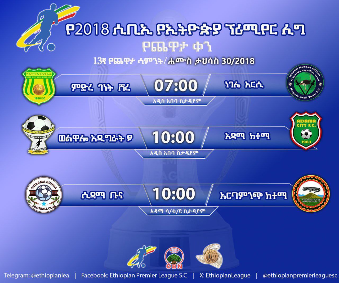 በሌላኛው መርሃ ግብር ምድረገነት ሽሬ ከነጌሌ አርሲ ከቀኑ 7 ሰዓት ላይ በአዲስ አበባ ስታዲየም ይጫወታሉ።