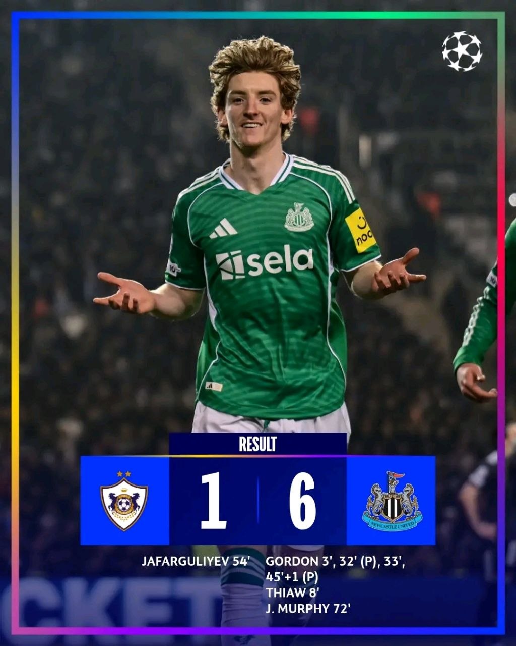 አዲስ አበባ፤ የካቲት 11 /2018(ኢዜአ)፦ በአውሮፓ ሻምፒዮንስ ሊግ የጥሎ ማለፍ ማጣሪያ መርሐ-ግብር ኒውካስትል ዩናይትድ ካራባግን 6 ለ 1 አሸንፏል።