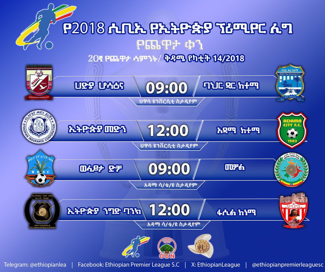 በዚህም መሠረት ምሽት 12 ሰዓት ላይ ኢትዮጵያ ንግድ ባንክ ከፋሲል ከነማ ምሽት በአዳማ ሳይንስ እና ቴክኖሎጂ ዩኒቨርሲቲ ስታዲየም ይጫወታሉ።