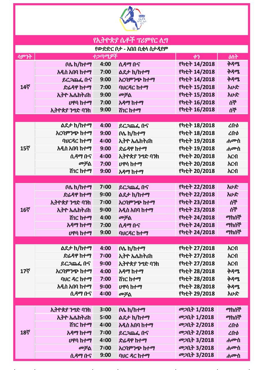 ከረፋዱ 4 ሰዓት ላይ ልደታ ክፍለ ከተማ ከይርጋጨፌ ቡና በአበበ ቢቂላ መታሰቢያ ስታዲየም ይጫወታሉ።