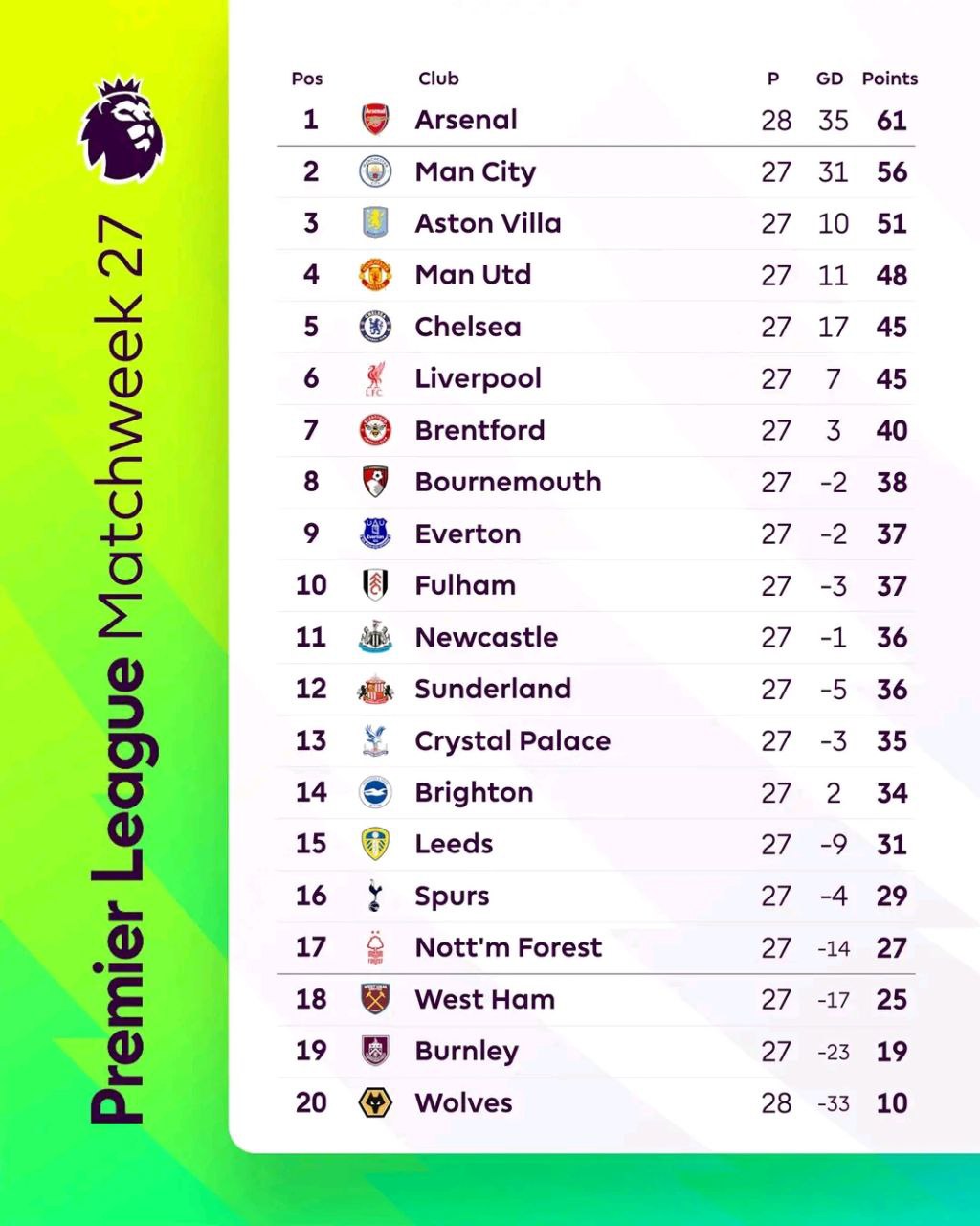 ዎልቭስ በ10 ነጥብ የመጨረሻውን 20ኛ ደረጃ ይዟል። አስቶንቪላ በ51 ነጥብ ሶስተኛ ደረጃ ላይ ተቀምጧል።