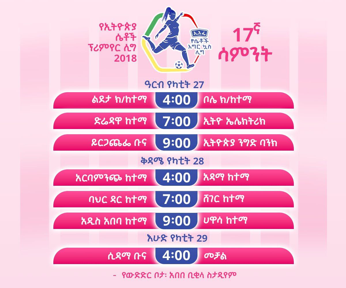አዲስ አበባ፤ የካቲት 28/2018 (ኢዜአ)፦ የኢትዮጵያ ሴቶች ፕሪሚየር ሊግ 17ኛ ሳምንት የሁለተኛ ቀን ውሎ ሶስት ጨዋታዎች ይደረጋሉ።