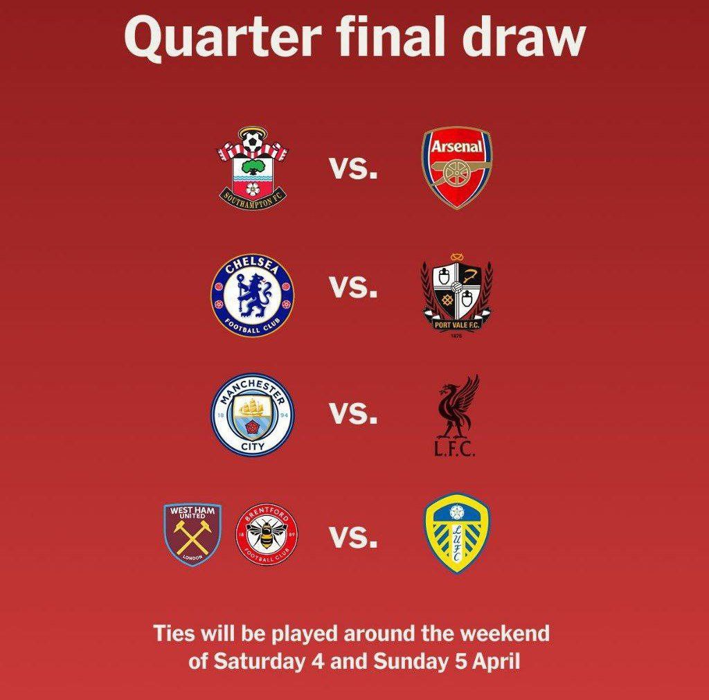 በወጣው የሩብ ፍጻሜ ድልድል ሳውዝሃምፕተን ከአርሰናል ፣ ማንችስተር ሲቲ ከሊቨርፑል፣ቼልሲ ከፖርት ቬል እና ዌስትሃም ዩናይትድ ከሊድስ ዩናይትድ ጋር ይጫወታሉ።