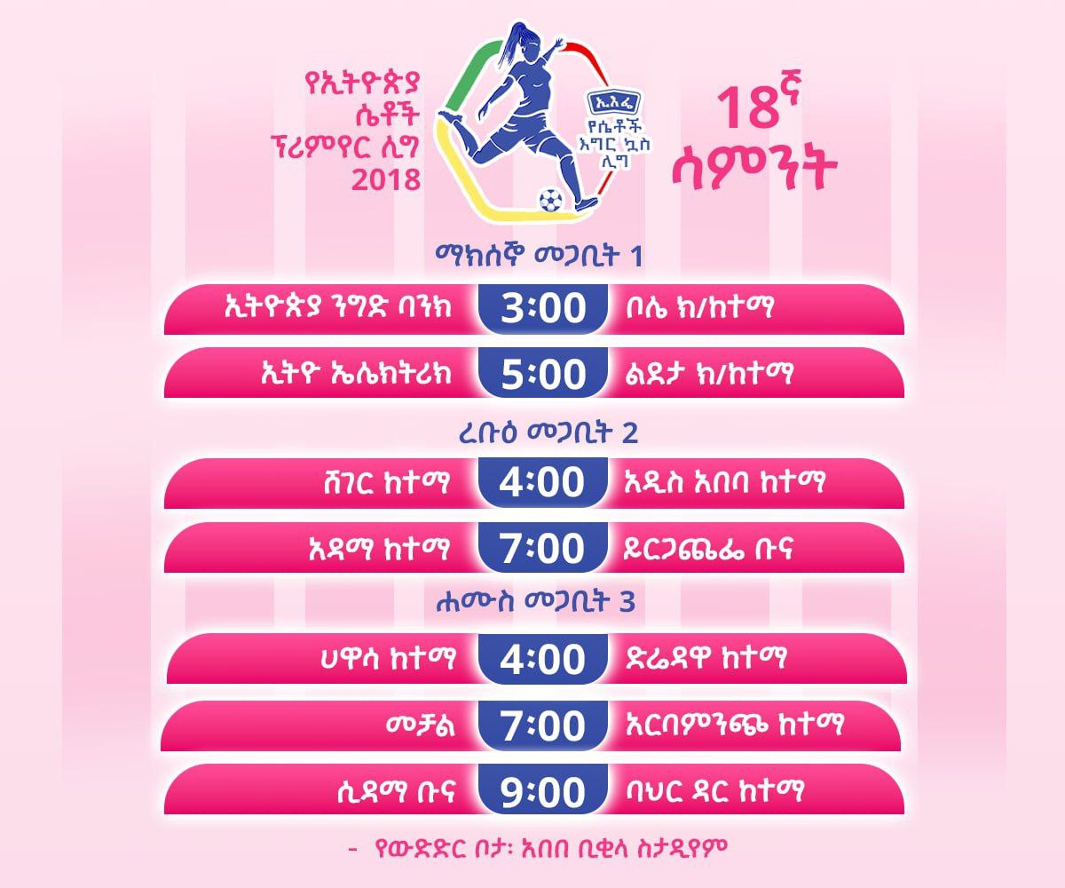 የኢትዮጵያ ሴቶች ፕሪሚየር ሊግ 18ኛ ሳምንት እስከ መጋቢት 3 ቀን 2018 ዓ.ም ይቆያል።