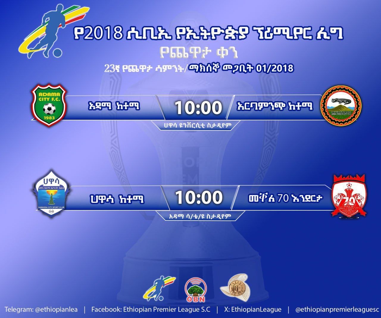 ከቀኑ 9 ሠዓት ላይ ሐዋሳ ከተማ ከመቀሌ 70 እንደርታ በአዳማ ሳይንስ እና ቴክኖሎጂ ዩኒቨርሲቲ ስታዲየም ጨዋታቸውን ያደርጋሉ።