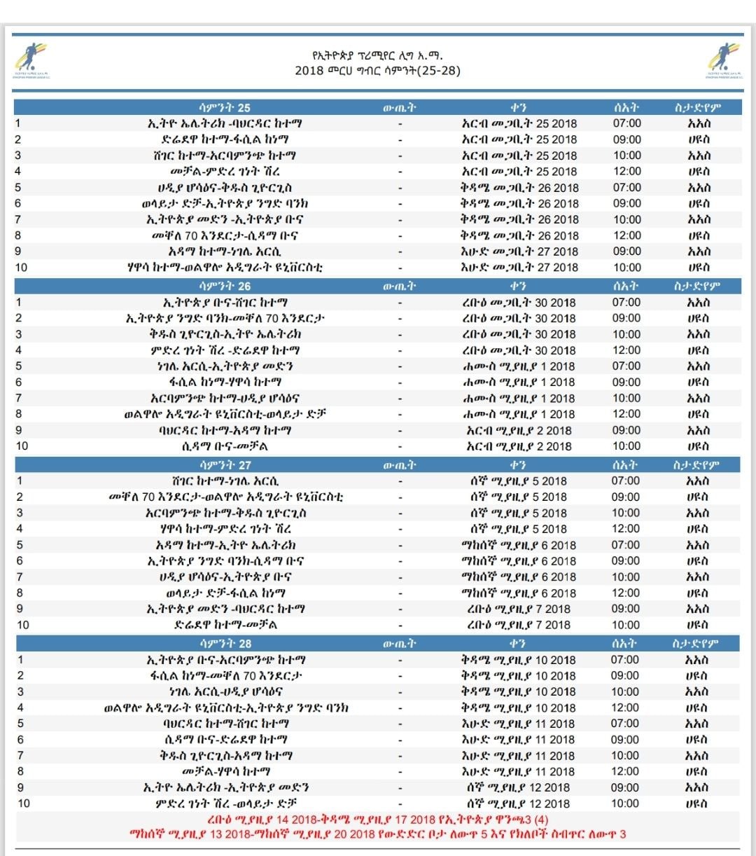 ከ25ኛ እስከ 28ኛ ሳምንት ጨዋታዎች በሃዋሳ ዩኒቨርሲቲ ስታዲየም እና አዲስ አበባ ስታዲየም ከመጋቢት 25 እስከ ሚያዚያ 12 ቀን 2018 ዓ.ም ይካሄዳል።