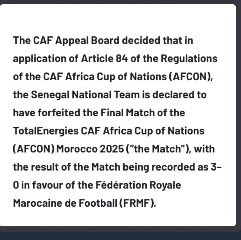 የሞሮኮ እግር ኳስ ፌዴሬሽን (FRMF) ያቀረበውን ይግባኝ ለመመርመር የተሰበሰበው የካፍ የይግባኝ ሰሚ ቦርድ የዲሲፕሊን ኮሚቴው ቀደም ብሎ ያስተላለፈውን ውሳኔ በመሻር ዋንጫውን ከሴኔጋል ተነጥቆ ለሞሮኮ እንዲሰጥ ወስኗል።