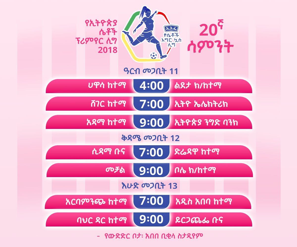 አዲስ አበባ፤ መጋቢት 11/2018(ኢዜአ)፦ የኢትዮጵያ ሴቶች ፕሪሚየር ሊግ 20ኛ ሳምንት ዛሬ ይጀመራል።