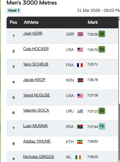 በወንዶች የ3000 ሜትር የፍጻሜ ውድድር አትሌት አዲሱ ይሁኔ 7 ደቂቃ ከ38 ሴኮንድ ከ60 ማይክሮ ሴኮንድ ስምንተኛ ወጥቷል።