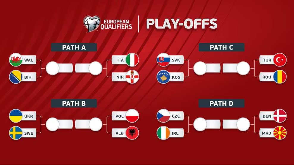 በመጨረሻው ማጣሪያ የጣልያን እና ሰሜን አየርላንድ አሸናፊ ከዌልስ እና ቦሲኒያና ሄርዜጎቪና አሸናፊ፣ የፖላንድ እና አልባኒያ አሸናፊ ከዩክሬንና ስዊድን አሸናፊ፣ የቱርክዬና ሮማኒያ አሸናፊ ከስሎቫኪያና ኮሶቮ አሸናፊ እንዲሁም የዴንማርክ እና ሰሜን ሜቄዶኒያ አሸናፊ ከቼክ ሪፐብሊክ እና አየርላንድ አሸናፊ ጋር ይጫወታሉ።