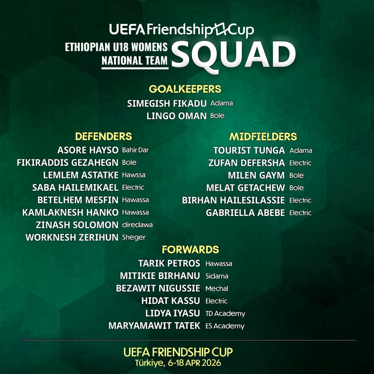 የአውሮፓ እግር ኳስ ማኅበር የሚያካሂደው የ’UEFA Frendship Cup’ ከ18 ዓመት በታች ሴቶች ውድድር በቱርክዬ አስተናጋጅነት ከመጋቢት 28 እስከ ሚያዚያ 10 ቀን 2018 ዓ.ም ይከናወናል።