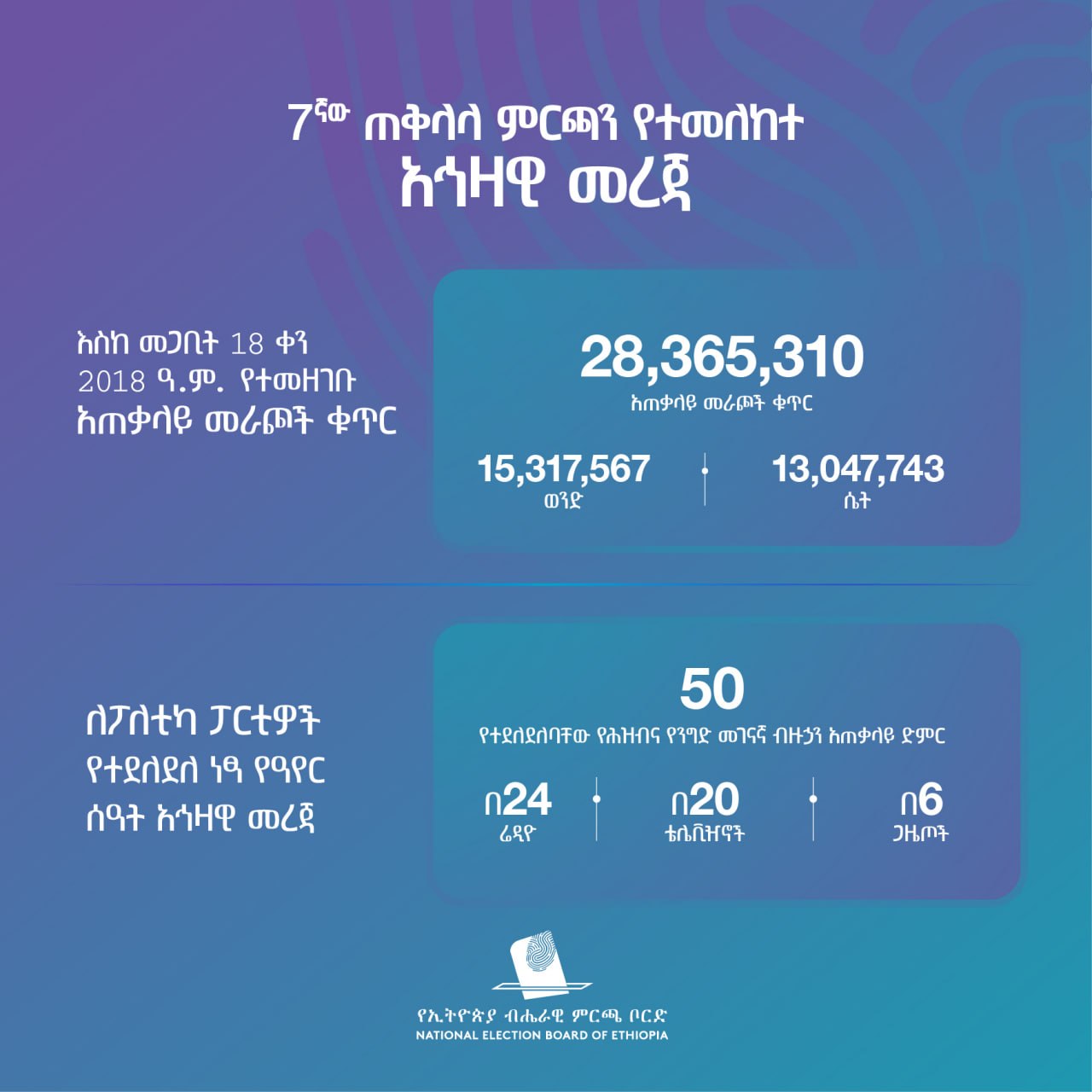 ምርጫ ቦርድ እስከ መጋቢት 18 ቀን 2018 ዓ.ም ድረስ 28 ሚሊዮን 365 ሺህ 310 መራጮች መመዝገባቸውን አስታውቋል።