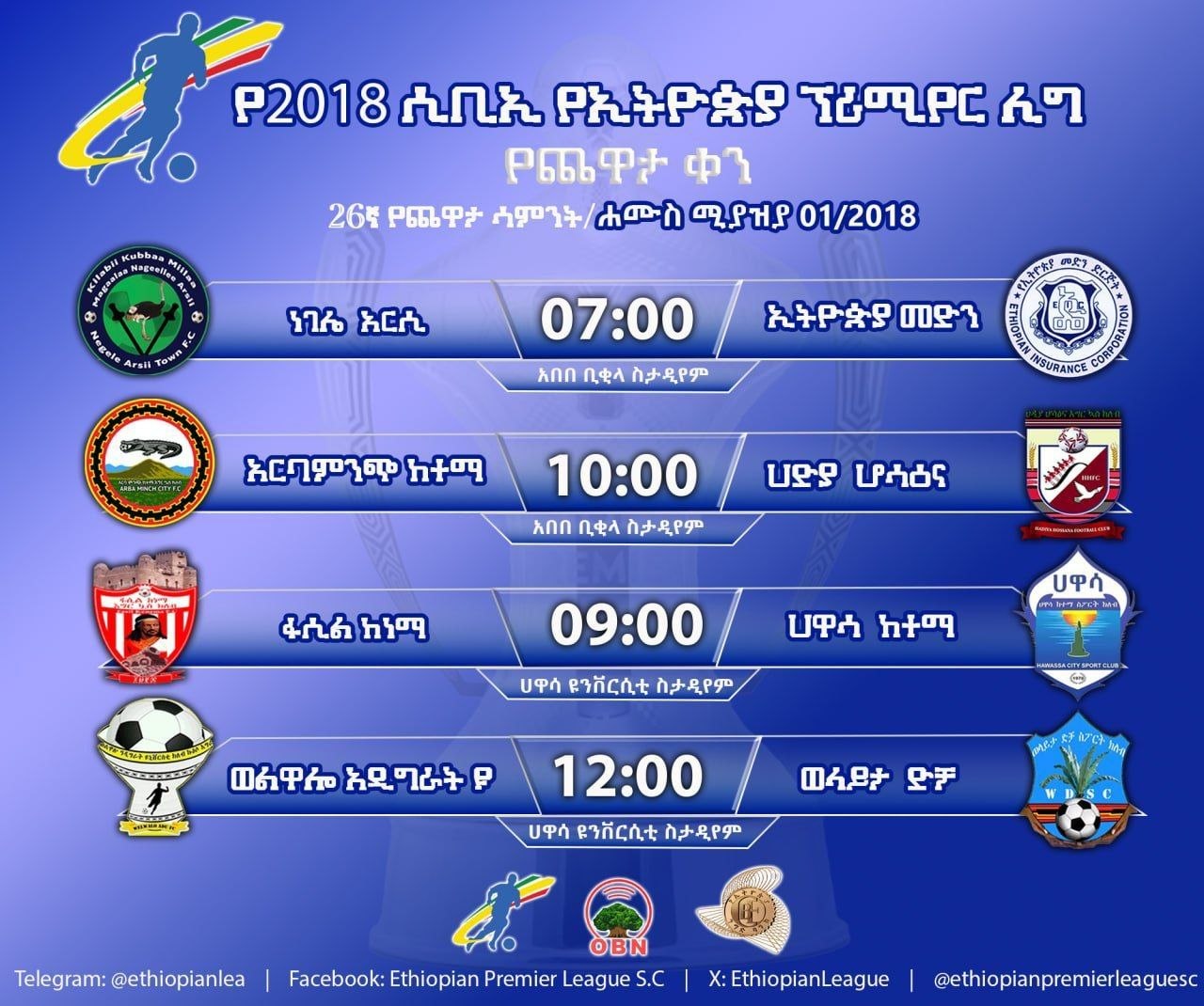 ከቀኑ 10 ሰዓት ላይ አርባምንጭ ከተማ ከሀዲያ ሆሳዕና በአበበ ቢቂላ ስታዲየም ይጫወታሉ።