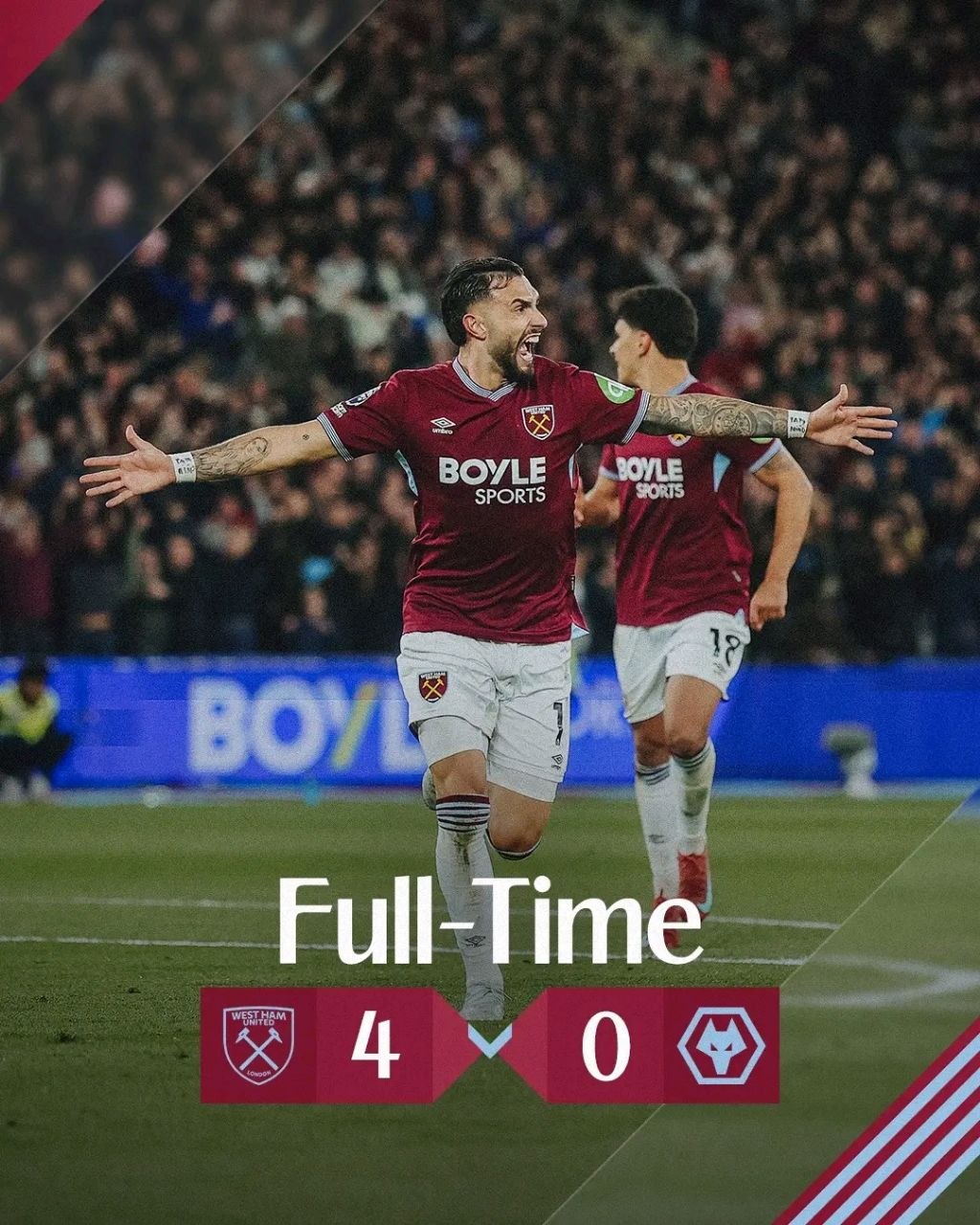 አዲስ አበባ፤ ሚያዝያ 3/2018 (ኢዜአ)፦ በእንግሊዝ ፕሪሚየር ሊግ የ32ኛ ሳምንት የመጀመሪያ መርሐ ግብር ዌስትሃም ዩናይትድ ዎልቭስን 4 ለ 0 በሆነ ሰፊ የግብ ልዩነት አሸንፏል።