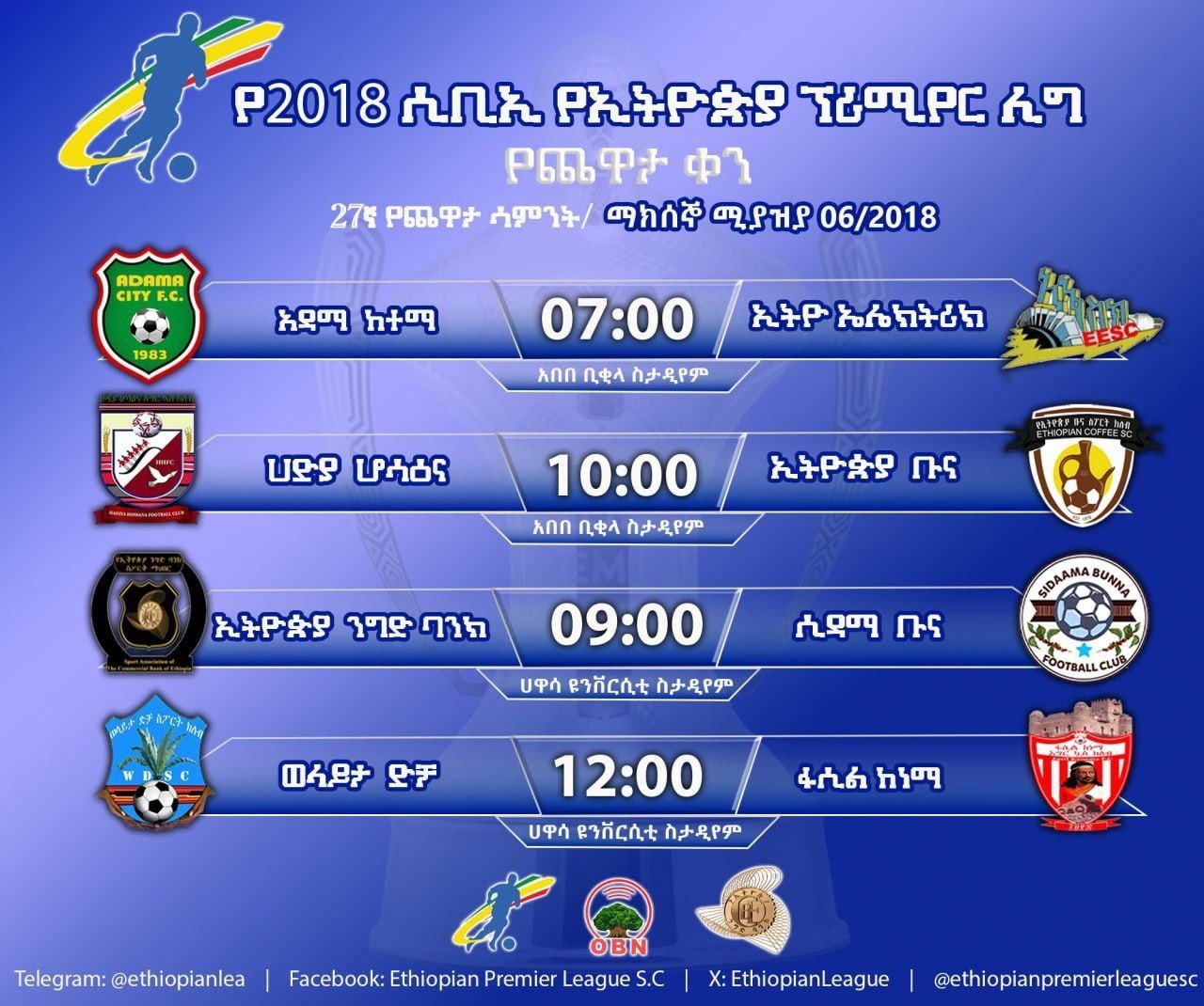 ከቀኑ 7 ሰዓት ላይ አዳማ ከተማ ከኢትዮ ኤሌክትሪክ በአበበ ቢቂላ ስታዲየም ይጫወታሉ።