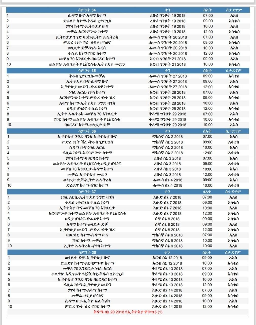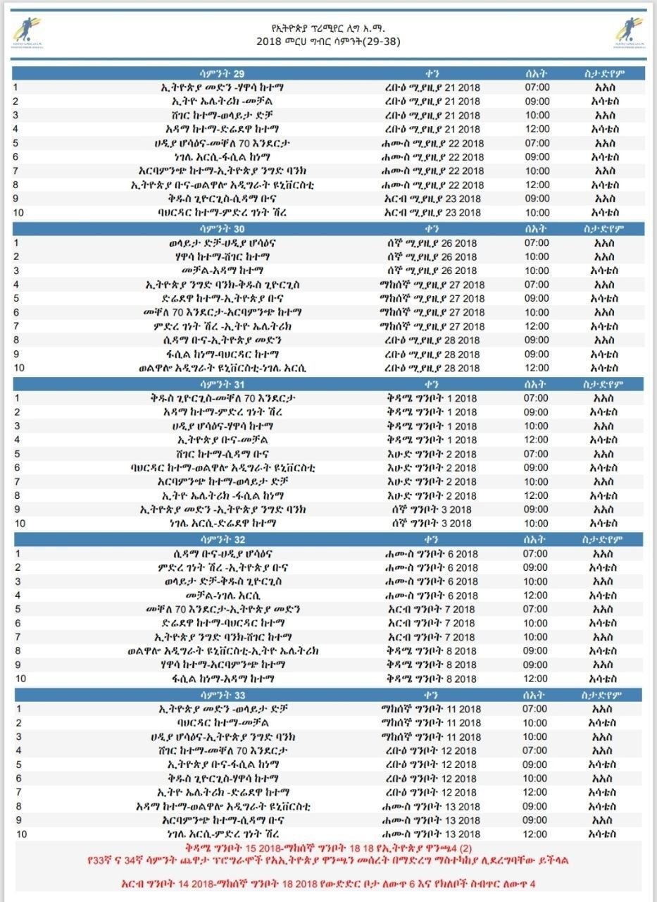 አዲስ አበባ፤ ሚያዝያ 9/2018 (ኢዜአ)፦ የኢትዮጵያ ፕሪሚየር ሊግ አክሲዮን ማህበር የ2018 የውድድር ዘመን መጠናቀቂያ የሆኑትን ከ29ኛ እስከ 38ኛ ሳምንት ያሉ የጨዋታ መርሐ ግብሮችን ይፋ አድርጓል።