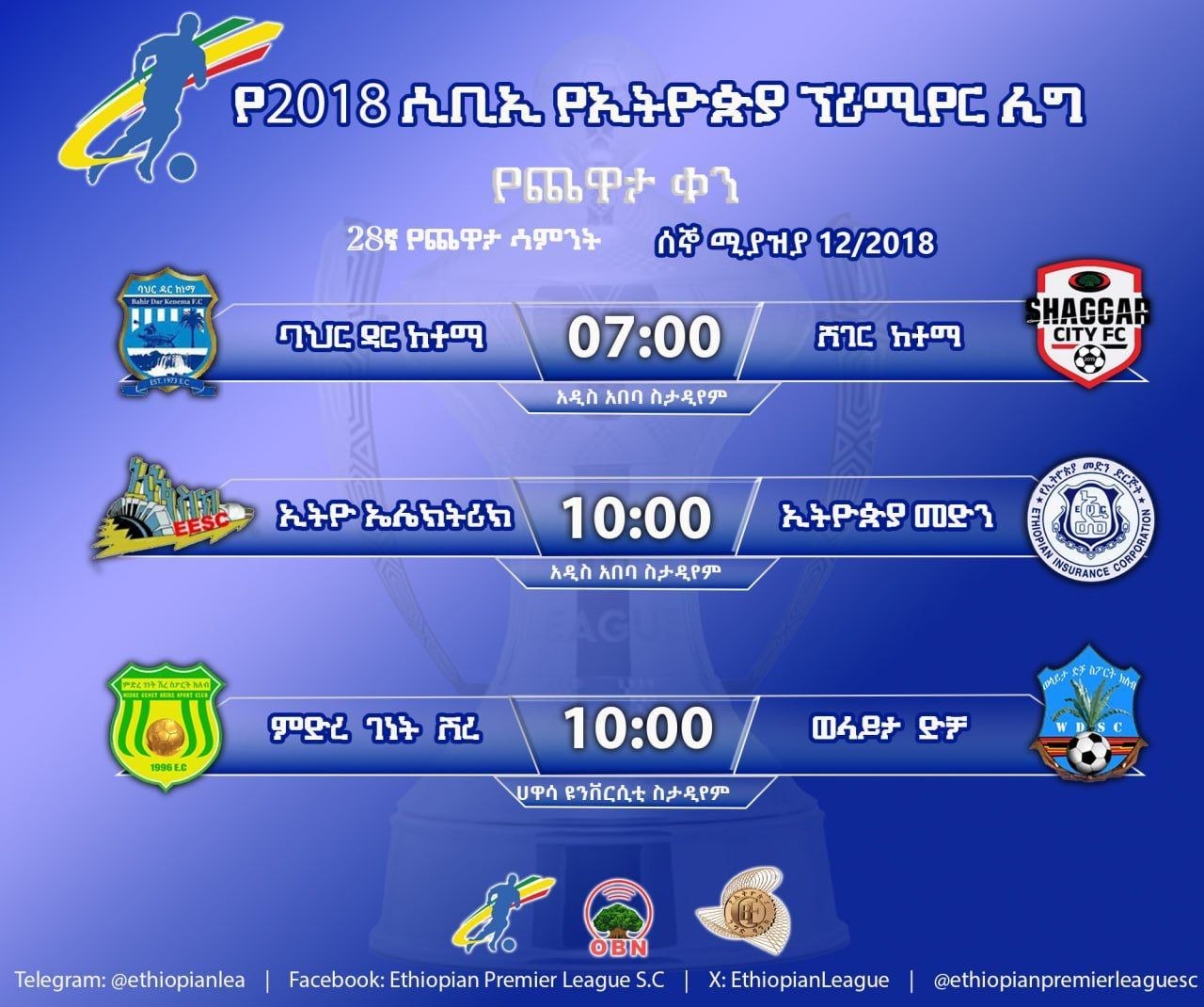 ከቀኑ 10 ሰዓት ኢትዮ ኤሌክትሪክ ከኢትዮጵያ መድን በአዲስ አበባ ስታዲየም ይጫወታሉ።