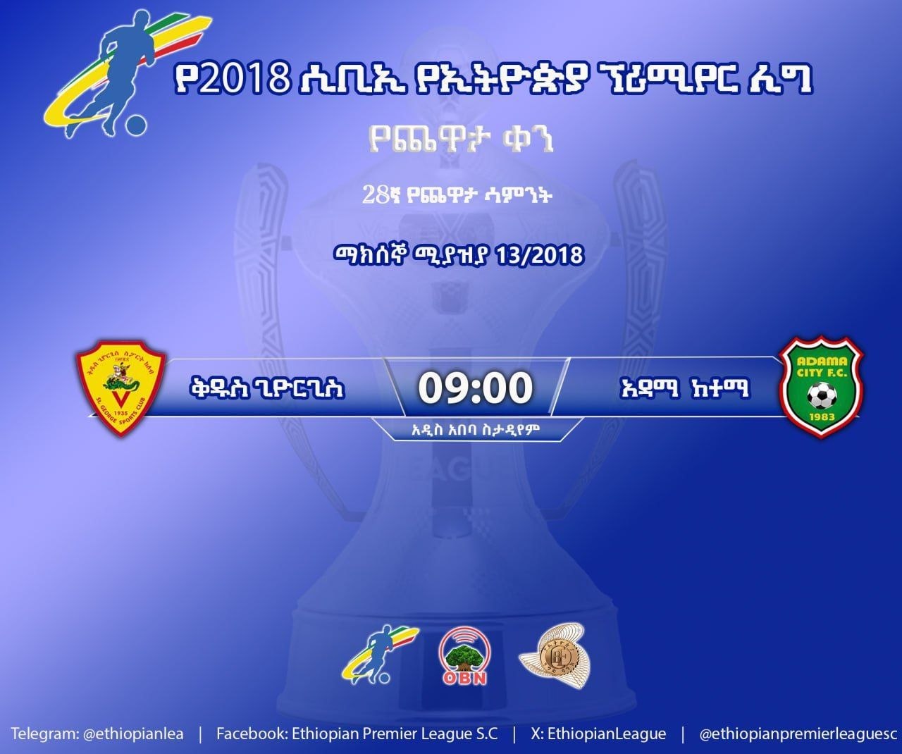 ከቀኑ 9 ሰዓት ላይ ቅዱስ ጊዮርጊስ ከአዳማ ከተማ በአዲስ አበባ ስታዲየም ጨዋታቸውን ያደርጋሉ።