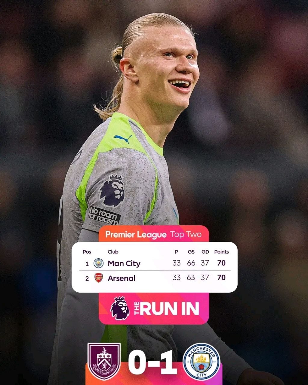 ሁለቱም ክለቦች በተመሳሳይ 70 ነጥብ እና 37 የግብ ክፍያ ቢኖራቸውም ማንችስተር ሲቲ ባስቆጠረው የጎል ብዛት (66) የሊጉ መሪ ሆኗል።