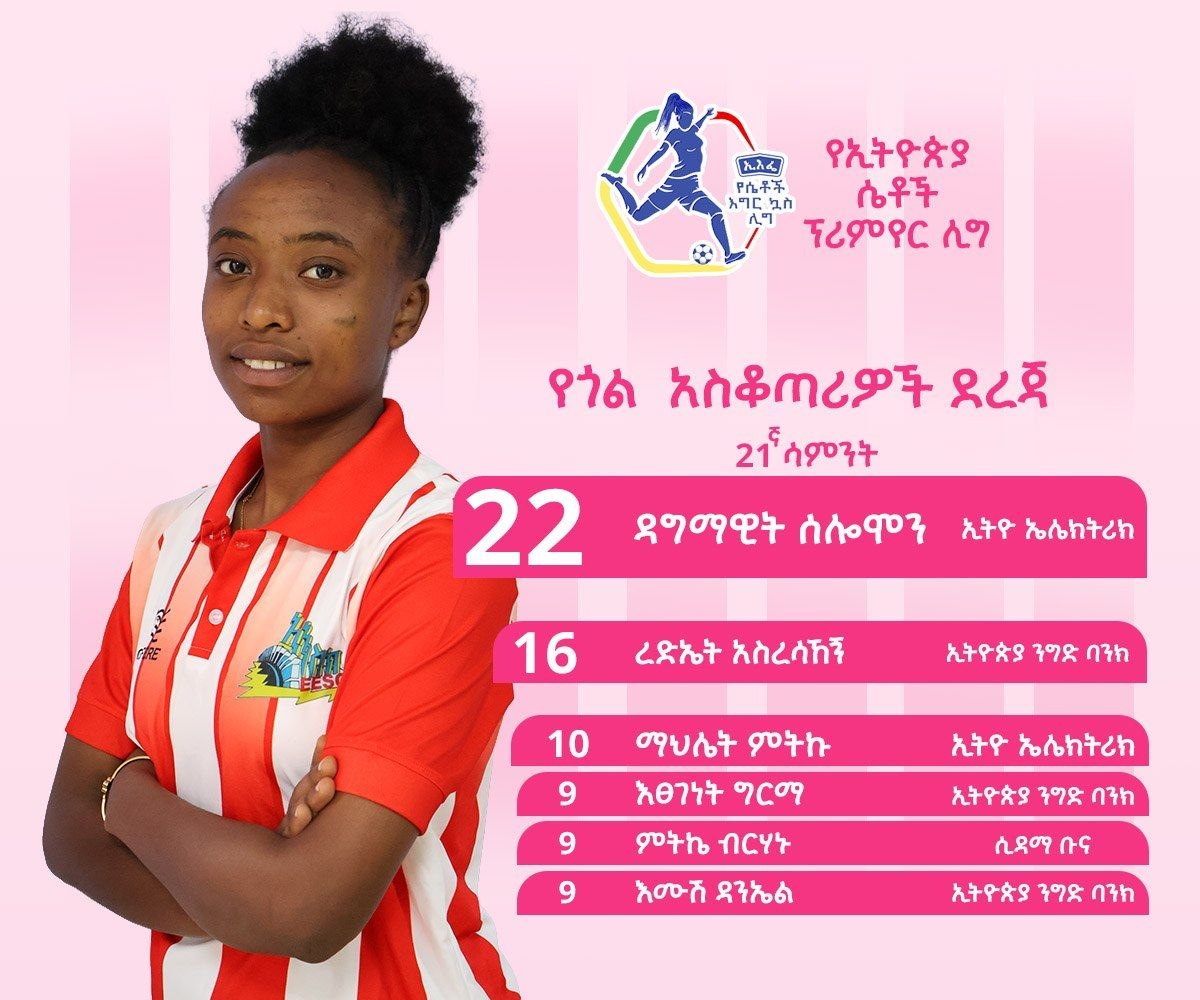 የኢትዮ ኤሌክትሪኳ ዳግማዊት ሰለሞን በ22 ግቦች የከፍተኛ ግብ አስቆጣሪነቱን እየመራች ነው። የኢትዮጵያ ንግድ ባንኳ ረድኤት አስረሳኸኝ በ16 ጎሎች ትከተላለች።