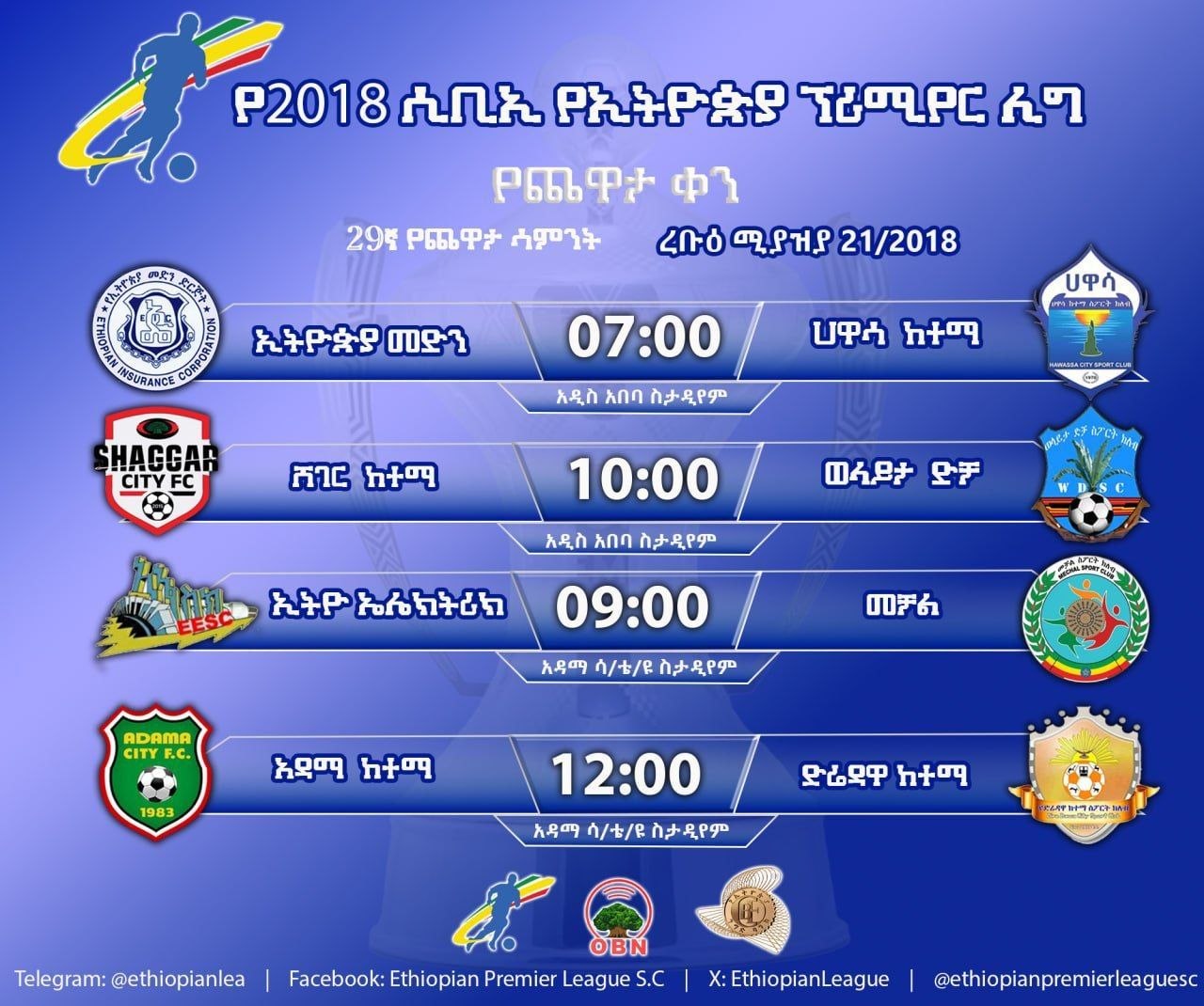 ከቀኑ 9 ሰዓት ኢትዮ ኤሌክትሪክ ከመቻል በአዳማ ሳይንስ እና ቴክኖሎጂ ዩኒቨርሲቲ ስታዲየም ይጫወታሉ።