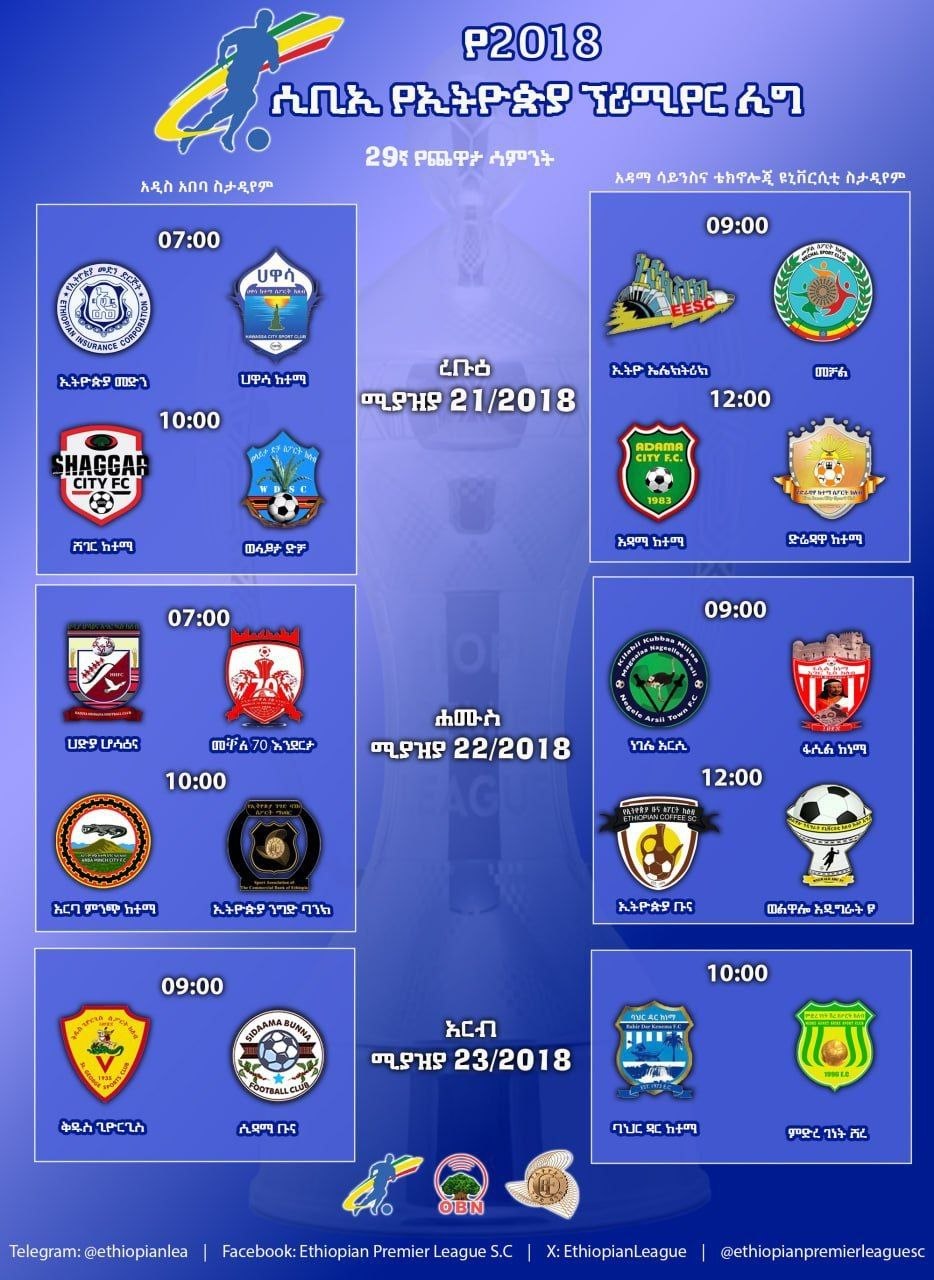 የኢትዮጵያ ፕሪሚየር ሊግ 29ኛ ሳምንት እስከ ሚያዚያ 23 ቀን 2018 ዓ.ም ይቆያል።