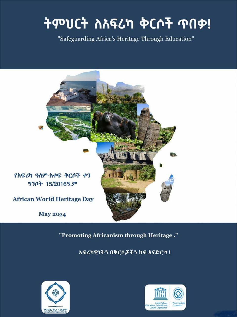 وستحتفل إثيوبيا بهذا اليوم للمرة الثامنة على المستوى القاري والثانية على المستوى الوطني غدًا تحت شعار: "التعليم من أجل حماية التراث العالمي الأفريقي"، في موقع تيا الأثري العالمي الواقع في منطقة غوراج بمنطقة وسط إثيوبيا.