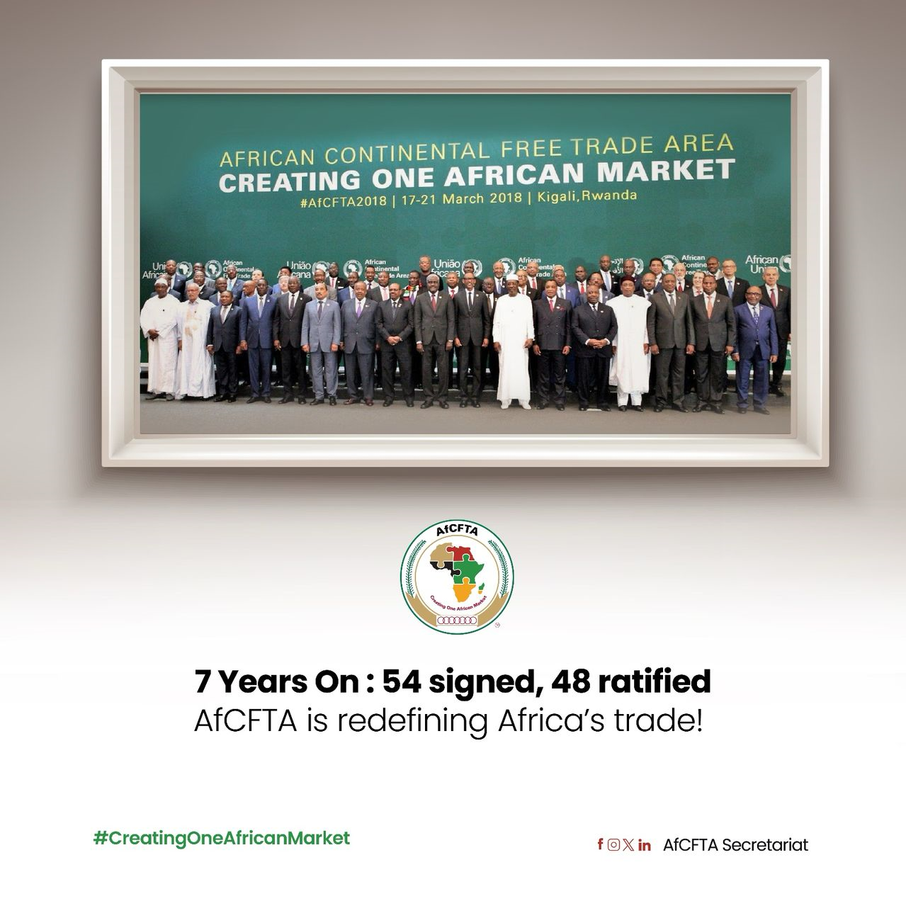 قبل سبع سنوات، وقّعت 44 دولة اتفاقية إنشاء منطقة التجارة الحرة القارية الأفريقية (AfCFTA). واليوم، وقّعت 54 دولة، وصدّقت 48 دولة، وتُشكّل اتفاقية التجارة الحرة القارية الأفريقية واقع التجارة في أفريقيا.