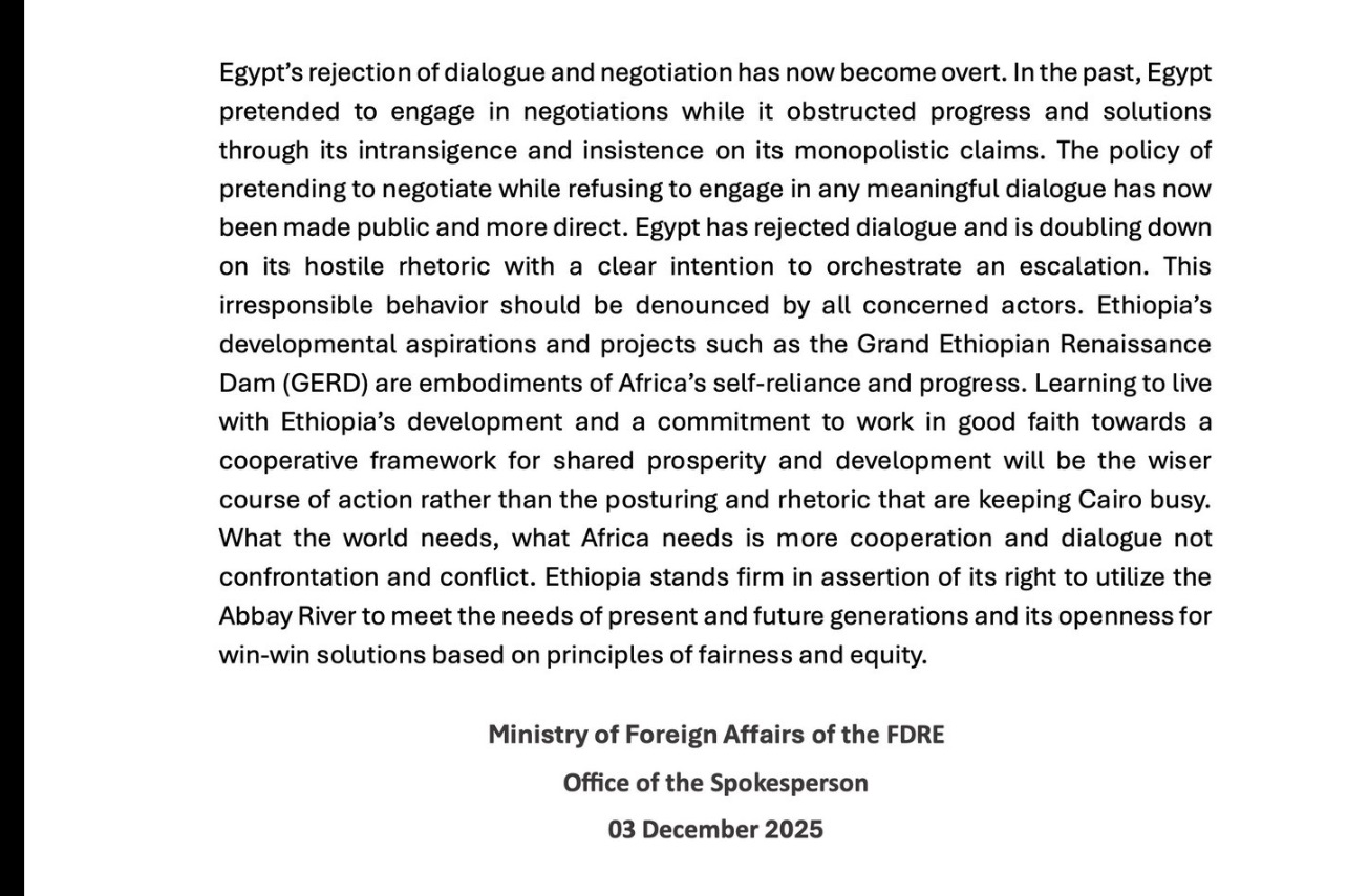لقد رفضت مصر الحوار وتضاعف خطابها العدائي بنية واضحة لتدبير التصعيد. يجب على جميع الجهات الفاعلة المعنية إدانة هذا السلوك غير المسؤول. إن تطلعات إثيوبيا التنموية ومشاريعها مثل سد النهضة الإثيوبي الكبير (GERD) هي تجسيدات لاعتماد إفريقيا على الذات والتقدم